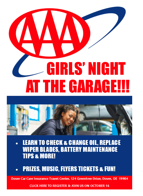Ladies, do you know how to check your car’s oil? Could you change a tire or the engine air filter? Come take the mystery out of car maintenance on October 16 and learn with WSTW’s Nancy Johnson from the Wake Up Crew, at AAA’s “Girls’ Night at the Garage” in Dover for a fun and educational evening! While you’re there be sure to spin the WSTW prize wheel and register to win tickets to the Flyers vs Wild game on October 18!